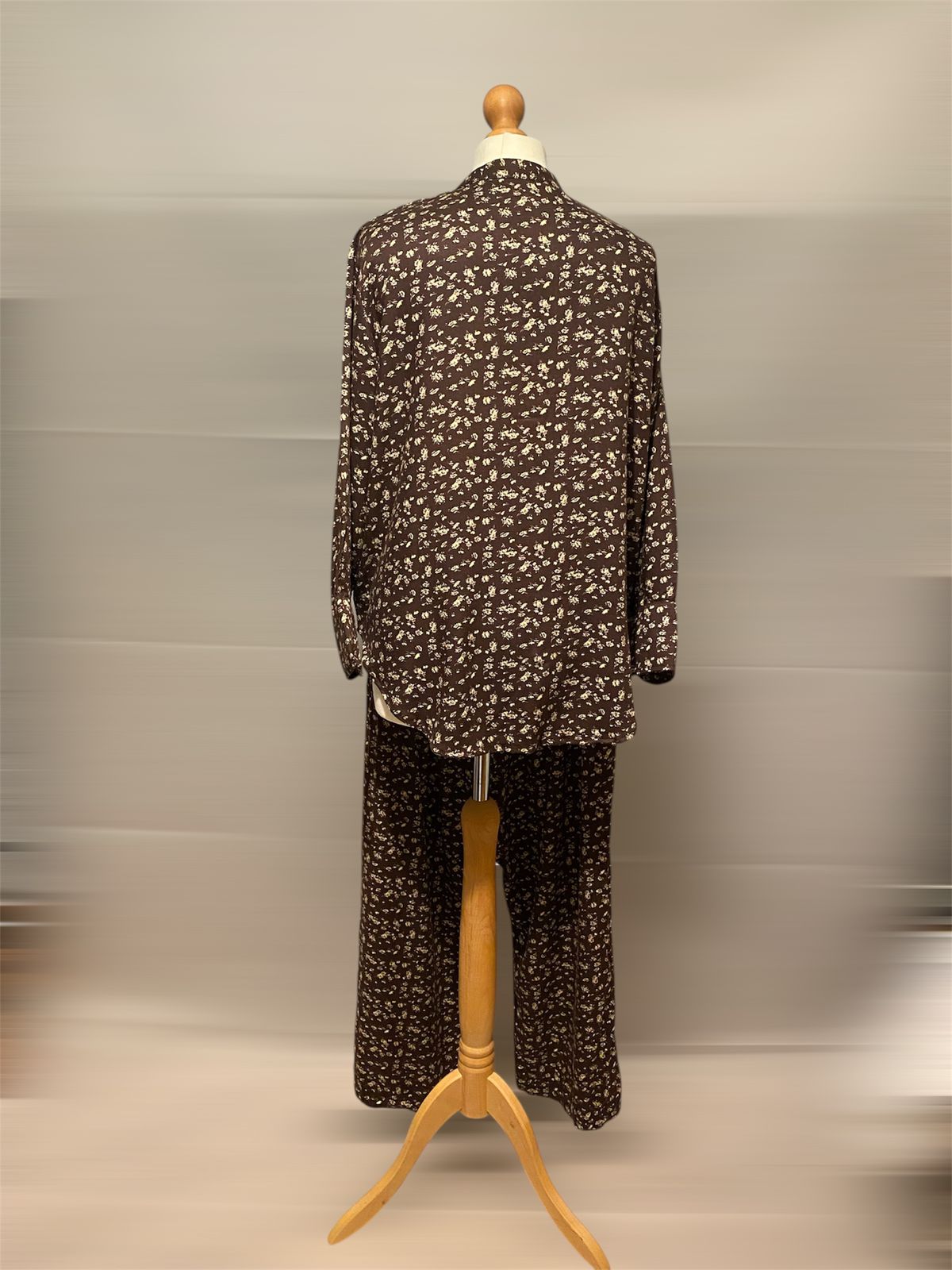It has a brown base covered in a small, repeating floral print of pale skin colour. It has a collar neckline and front button down opening. Sleeves are long with button cuff details.
