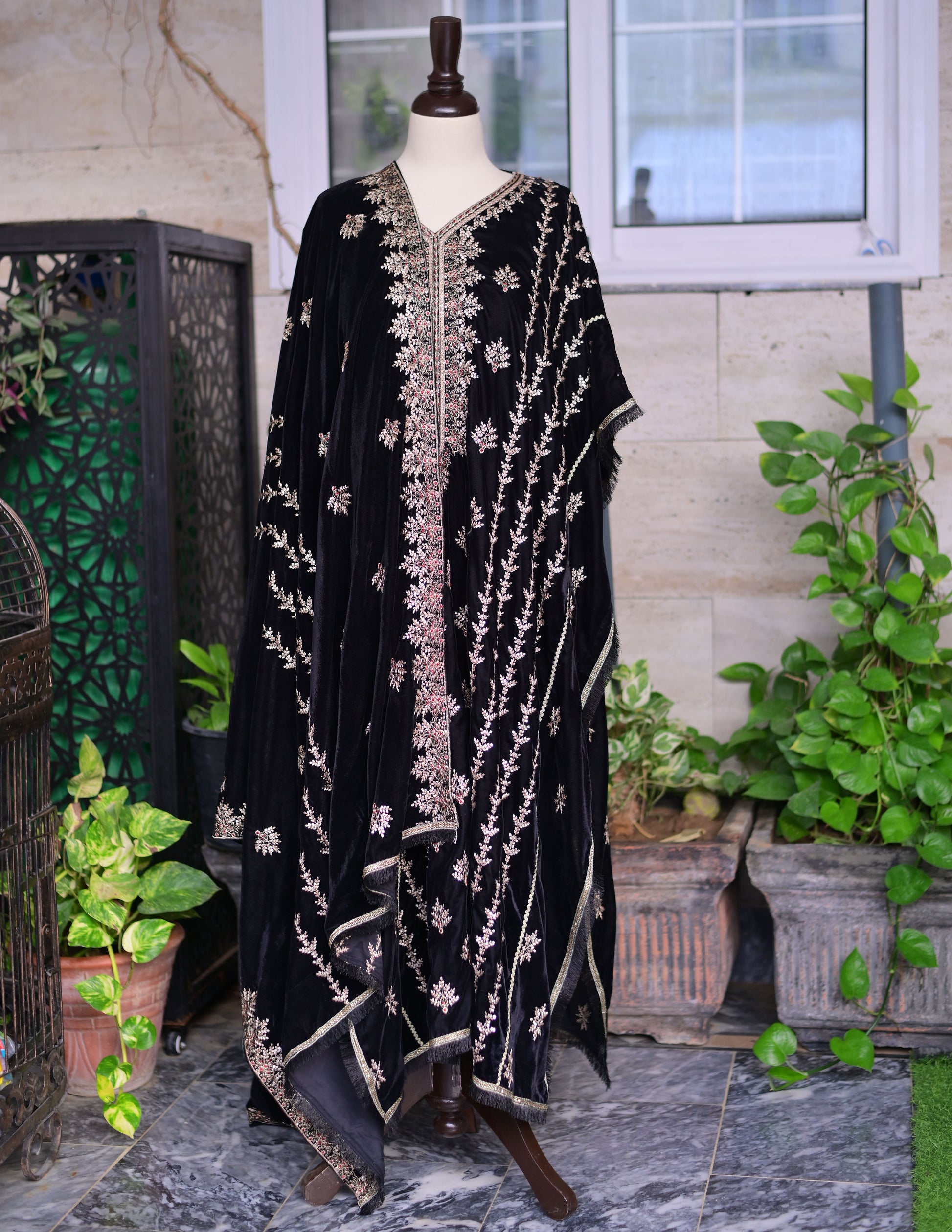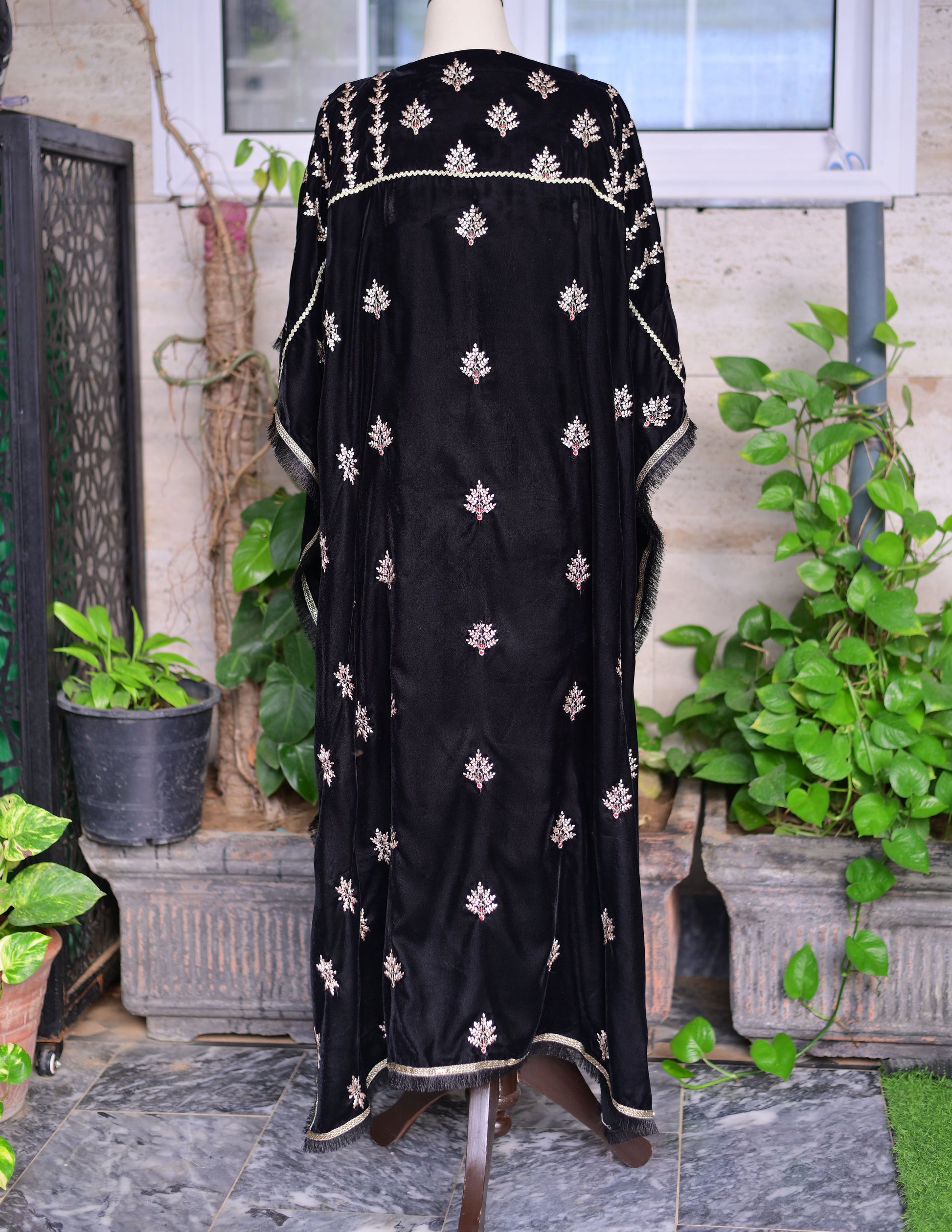 This black velvet 3-piece embroidered kaftan set is perfect for formal occasions. The floral pattern and embroidered accents add a touch of elegance, while the V-neck neckline and long dress length create a sophisticated look. Made from high-quality velvet fabric and golden thread work all over', this kaftan is both stylish and comfortable, making it an ideal choice for any season. The set includes a matching shawl and trouser, offering a coordinated and chic outfit for your next fancy event. Designed by the brand Shufera in Pakistan, this kaftan embodies a blend of traditional and modern style.